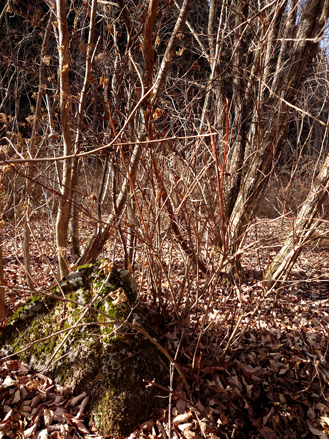 | 山採り地Bから クロモジ2.5&3.0m、小ぶりのアオハダ、3.5mネジキ、2.5mオオモミジ、コウヤボウキx10を背負ってきたよ。 昼過ぎ暗雲で時雨れ小雪舞う、ちょー寒いのだよ。 まだ緑の葉のヤマツツジが元気 一ケ所作業道拡張工事しないと窮屈、週明け作業 |