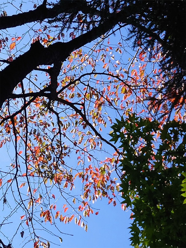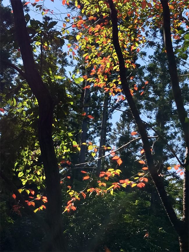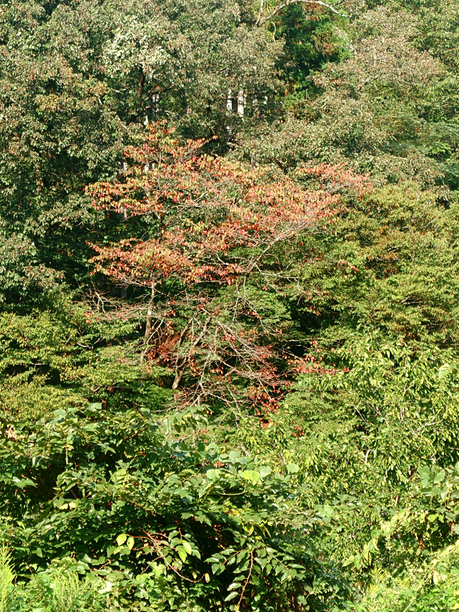 | 山桜紅葉真っ盛り・周囲が緑なので赤が目立って綺麗 | |