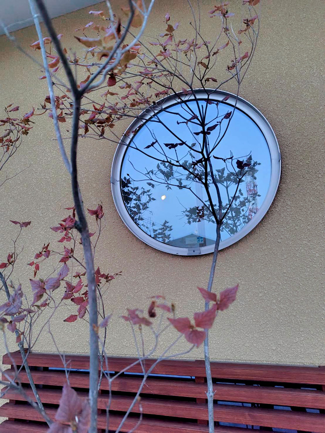 | 月を愛でる丸窓からミツバツツジ越しに観月 | |