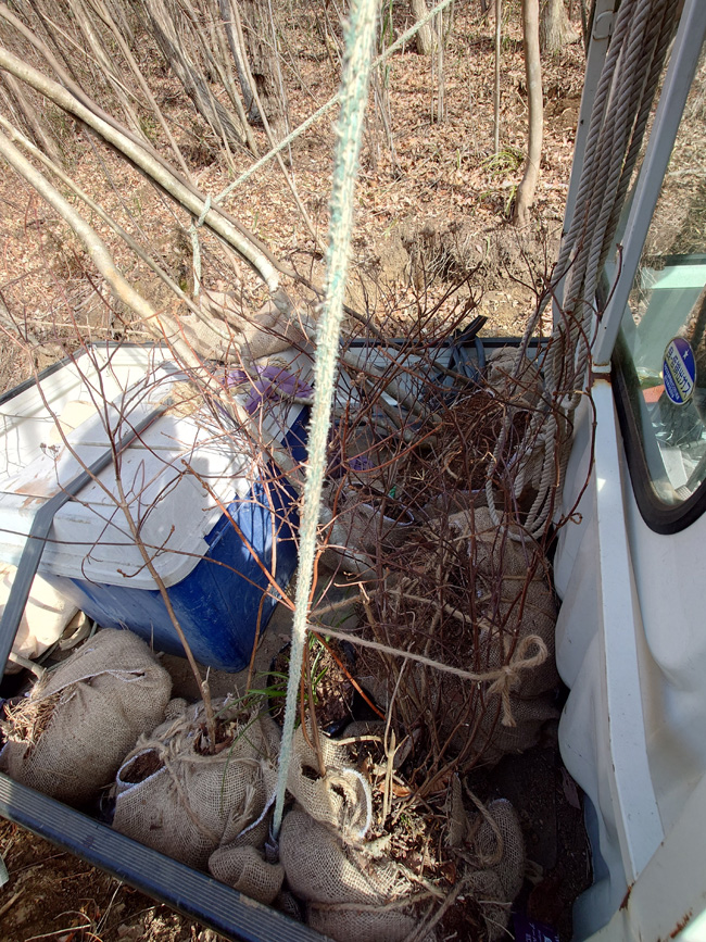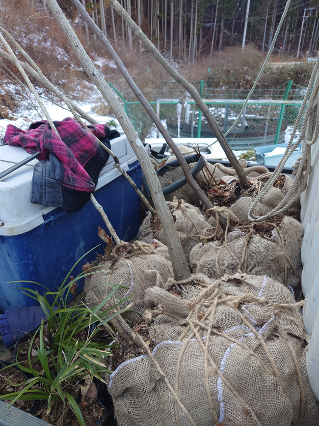 ![]() | 左・東京K邸向1.5mクロモジ 3.8m株立アオハダ山に置いてけぼり、 {3mアカシデ x2、2.5m アオハダx2、2.5m ナツハゼ、クロモジ等々}軽トラで背負ってきたよ |