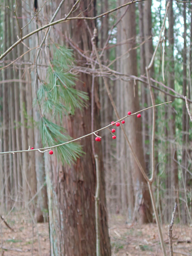 | 山採り地Bから クロモジ2.5&3.0m、小ぶりのアオハダ、3.5mネジキ、2.5mオオモミジ、コウヤボウキx10を背負ってきたよ。 昼過ぎ暗雲で時雨れ小雪舞う、ちょー寒いのだよ。 まだ緑の葉のヤマツツジが元気 一ケ所作業道拡張工事しないと窮屈、週明け作業 |