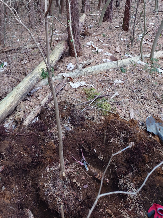 | ネジキを掘る、倒木や隣の大木の太い根が邪魔して | |