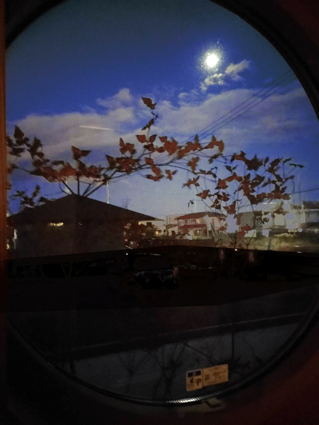 | 丸窓から三つ葉躑躅越しに月を愛でる | |
