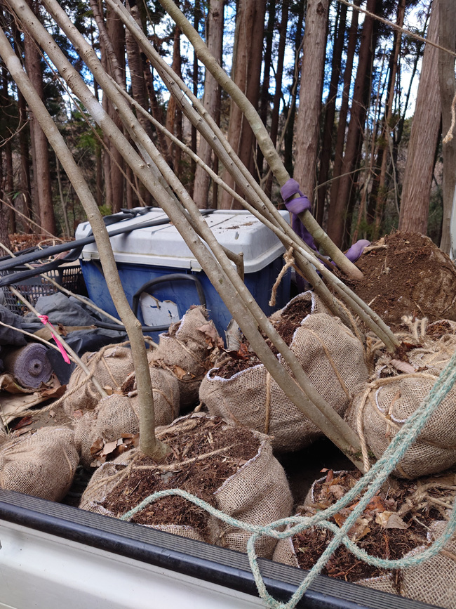 ![]() | 左・東京K邸向1.5mクロモジ 3.8m株立アオハダ山に置いてけぼり、 {3mアカシデ x2、2.5m アオハダx2、2.5m ナツハゼ、クロモジ等々}軽トラで背負ってきたよ |