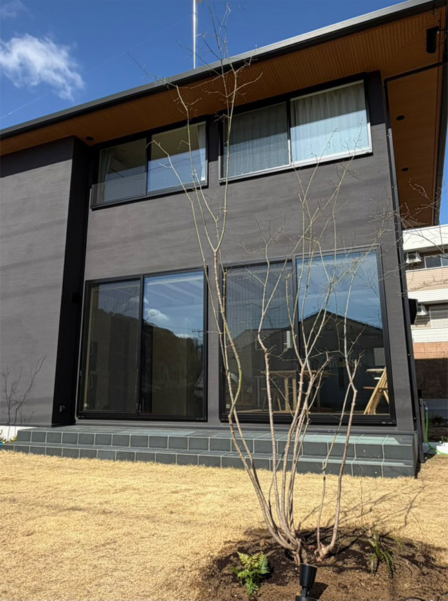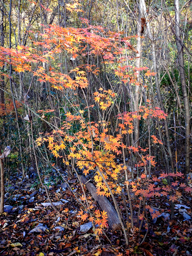 ネジキ3.5m。、ヤマツツジ1.3m、株立オオモミジ2.5m、下草にシュンラン、コウヤボウキ。ショウジョウバカマ、ウスノキ等などを植えました。