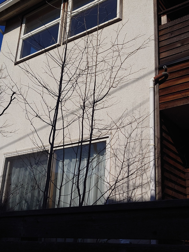 白壁に映える線の細いアオハダとミツバツツジ右側オオモミジ